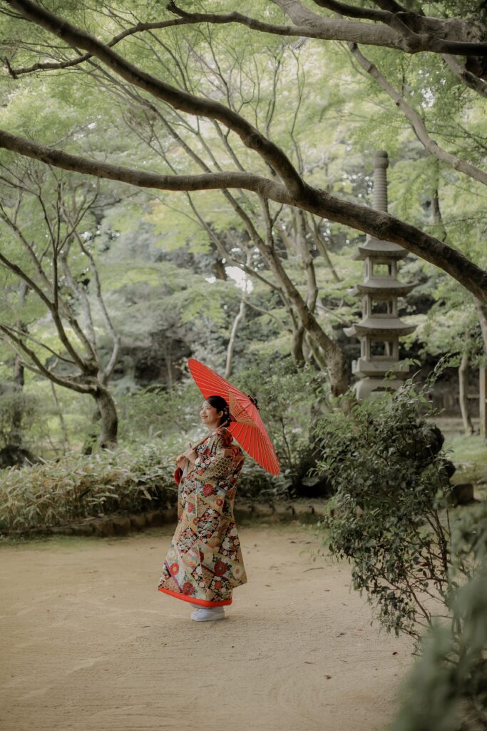 - 日本庭園: 新緑と庭園の融合に和装が美しく映える季節!和装は暑くなる前の撮影がおすすめ。
